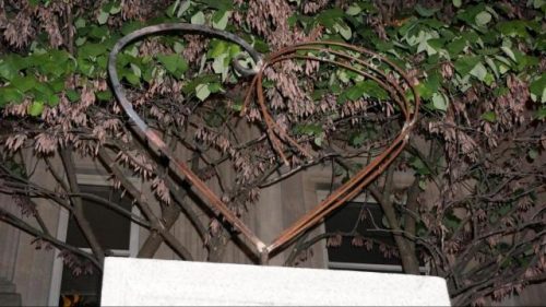 One week after the Durham soldier came down, another sculpture replaced it: a metal heart, mounted on the pedestal. It was an example of how art can reshape a place, and change its meaning. This new sculpture did not last long; the police came to the site within hours and hauled it away. I can’t help but wonder if the crumpled soldier and the metal heart are sitting together somewhere, in a Durham storage facility. If so, what an eloquent Still Life of Protest that would make.