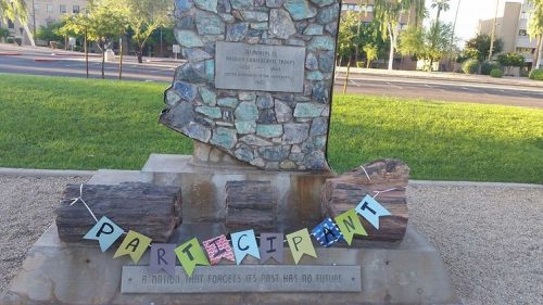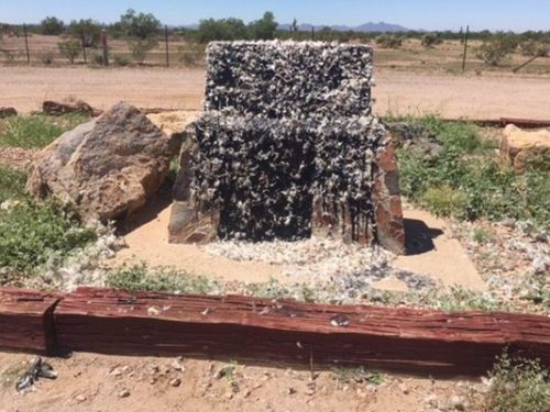 On Thursday, August 17, passersby noticed that the stone monument marking US Route 60 (east of Phoenix) as “Jefferson Davis Memorial Highway,” had changed markedly in appearance. Someone had poured tar, and then feathers, over the top of the monument. The tar has dripped into rivulets and the feathers flutter in the breeze, making this transformation a rather dynamic act of protest. It is also an act with historical meaning.