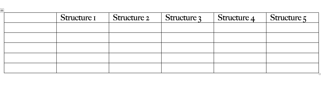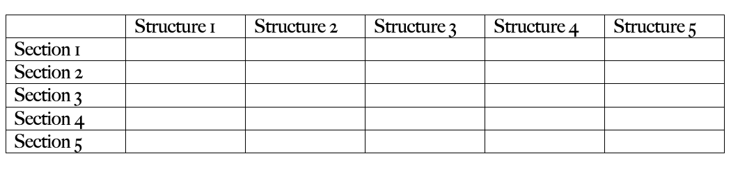Start filling in the grid with five possible structures for your project, each with five sections. You may have more than five sections for any given structure. That’s fine. And you may think of more than five structures. That’s great.